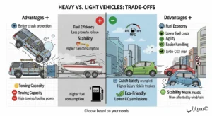 سيارات ثقيلة | – مقاومة أكبر للصدمات في الحوادث. – ثبات أعلى على الطرق السريعة وفي الأجواء العاصفة. – قدرة أفضل على السحب ونقل الأحمال. | – استهلاك وقود أعلى بسبب الكتلة. – صعوبة أكبر في المناورة داخل المدن أو أثناء الركن. – فرملة أبطأ ومسافة توقف أطول. |